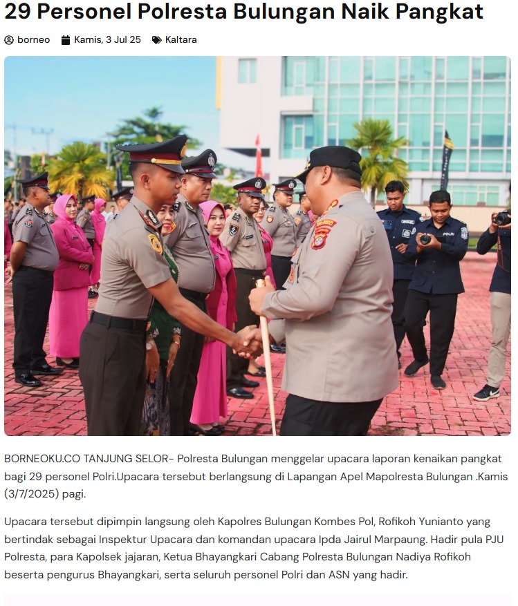 Berita 29 Personel Polresta Bulungan Naik Pangkat 10 bulan ago admin Related Posts:Kapolresta Bulungan Resmi Naik Pangkat Jadi Kombes…Kapolresta Bulungan Pimpin Upacara Korp Raport…31 Personel Polresta Bulungan Naik Pangkat,…"Usai Naik Pangkat, Kapolresta Bulungan Ingatkan:…31 Personel Polresta Bulungan Raih Kenaikan Pangkat,…Tradisi Siram Bunga dan Syukuran Warnai Kenaikan… Continue Reading Previous Antisipasi Gangguan Keamanan, Polresta Bulungan Perketat Pengawasan di Titik StrategisNext 31 Personel Polresta Bulungan Naik Pangkat, Kapolresta: “Semoga Jadi Motivasi Dalam Pengabdian” More Stories Berita Bukan Sekadar Hadir, Kapolsek Tanjung Palas Barat Tunjukkan Komitmen di Persiapan HUT RI, Ini yang Ditekankan 1 jam ago admin Berita Peran Aktif Polri Dampingi Petani, Panen Jagung di Karang Agung Tetap Dioptimalkan Meski Alami Keterlambatan 1 hari ago admin Berita Turun ke Ladang, Bhabinkamtibmas Tanjung Palas Utara Pastikan Panen Jagung Berjalan Optimal 2 hari ago admin