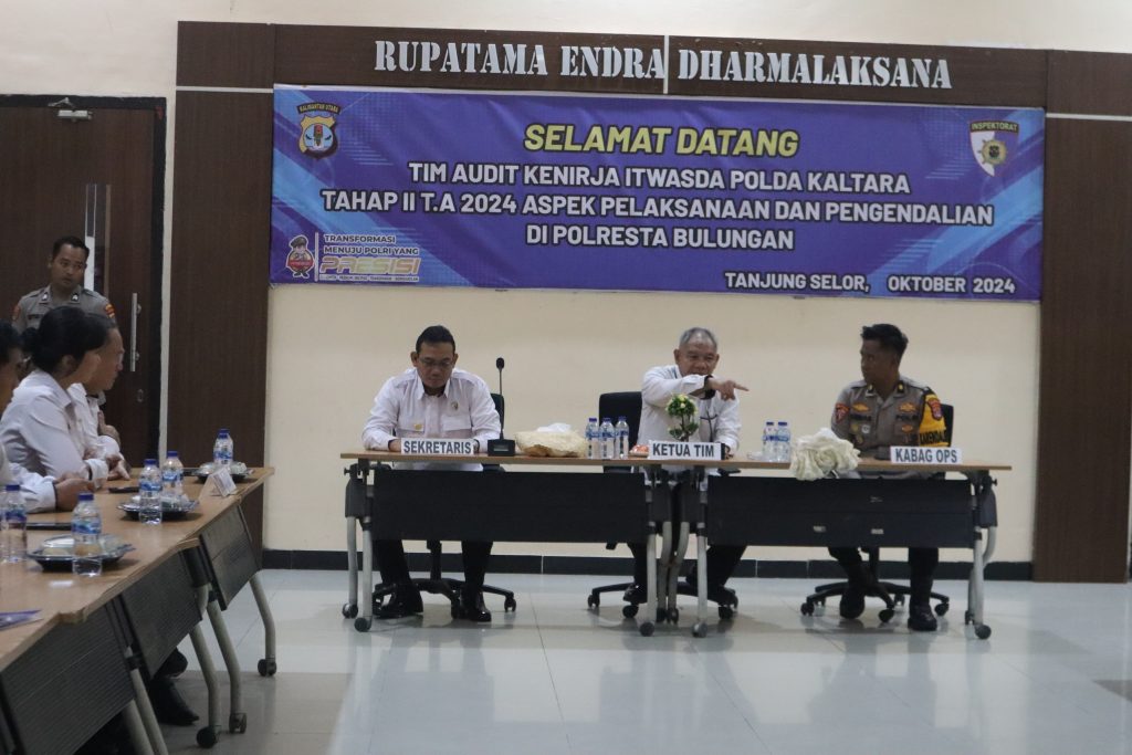 TANJUNG SELOR, Polda Kaltara, Polresta Bulungan – Polresta Bulungan menggelar Audit Itwasda Polda Kalimantan Utara Tahap II Tahun Anggaran (TA) 2024 yang menitikberatkan pada aspek pelaksanaan dan pengendalian, Selasa (29/10/2024). Kegiatan audit yang berlangsung di Aula Polresta Bulungan ini dihadiri oleh tim audit dari Inspektorat Pengawasan Daerah (Itwasda) Polda Kaltara yang dipimpin oleh KBP TONY BUDIARTO sebagai ketua tim audit.