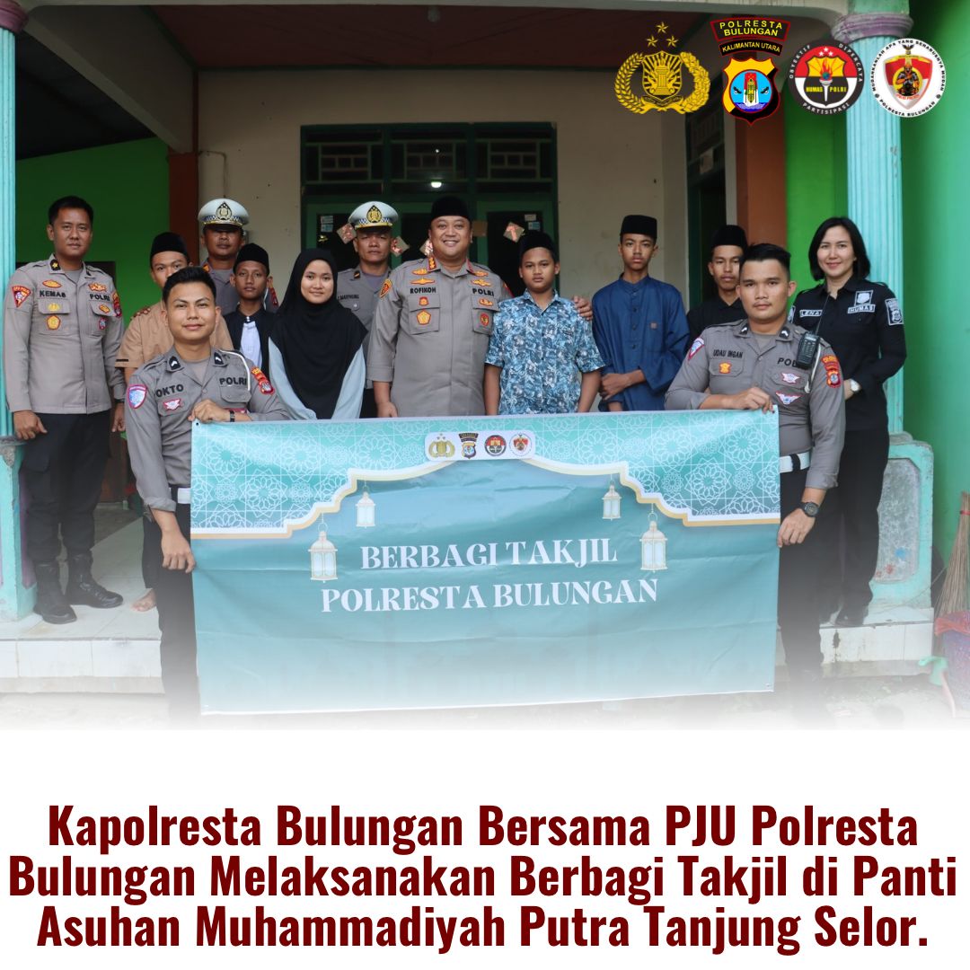 Dalam semangat bulan suci Ramadan 1446 H, Kapolresta Bulungan, Kombes Pol Rofikoh Yunianto, S.I.K., bersama Pejabat Utama (PJU) Polresta Bulungan, menggelar aksi sosial dengan membagikan takjil kepada anak-anak Panti Asuhan Muhammadiyah Putra di Tanjung Selor, pada Senin, 10 Maret 2025.