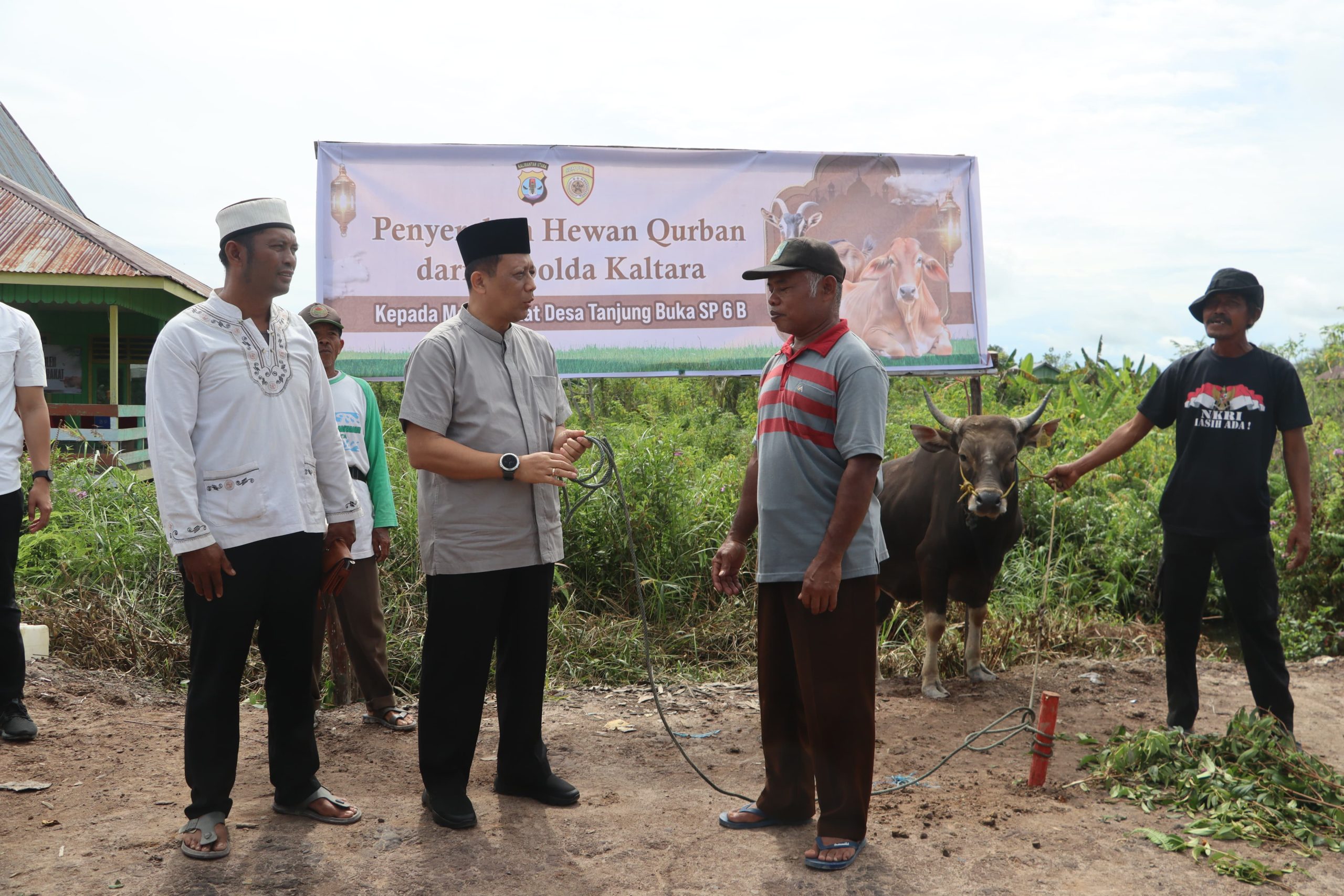 TANJUNG SELOR, Polda Kaltara, Polresta Bulungan – Dalam semangat kebersamaan dan kepedulian sosial menjelang Hari Raya Iduladha, Kapolda Kalimantan Utara Irjen Pol. Hary Sudwijanto, S.I.K., M.Si dan Kapolresta Bulungan KBP Rofikoh Yunianto, S.I.K. menyerahkan hewan kurban kepada masyarakat Desa Tanjung Buka SP6B, SP7, SP8, dan SP9, Kecamatan Tanjung Palas, Kabupaten Bulungan, pada Jumat, 6 Juni 2025 pukul 10.20 WITA, bertempat di Balai Pertemuan Umum (BPU) SP6B.