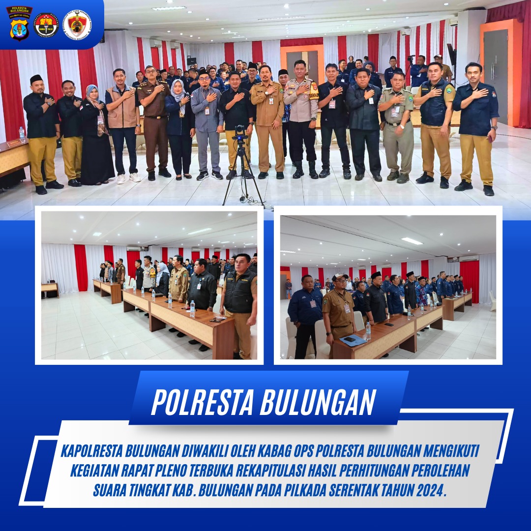 Mewakili Kapolresta Bulungan, AKBP Rofikoh Yunianto, S.I.K, Kabag Ops Polresta Bulungan, Kompol Kemas Zein Errie Limantara, S.I.P., S.I.K, menghadiri Rapat Pleno Terbuka Rekapitulasi Hasil Perhitungan Perolehan Suara tingkat Kabupaten Bulungan pada Pemilihan Gubernur dan Wakil Gubernur serta Bupati dan Wakil Bupati Tahun 2024
