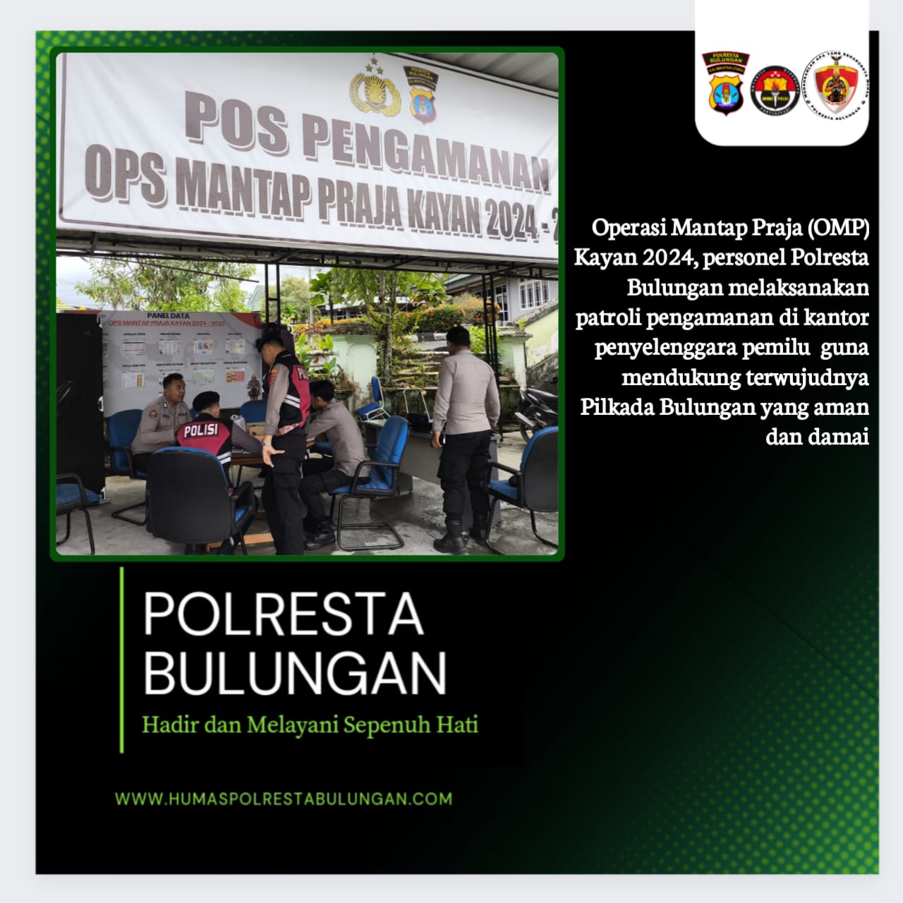 Pasca penyelenggaraan Pilkada 2024, Polresta Bulungan meningkatkan pengamanan di Gudang Logistik Pilkada yang berlokasi di Dome Sport Centre, Kabupaten Bulungan. Langkah ini merupakan bagian dari Operasi Mantap Praja Kayan 2024–2025