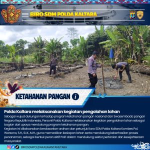 Sebagai wujud dukungan terhadap program ketahanan pangan nasional dan Swasembada pangan Negara Republik Indonesia, Personil Polda Kaltara melaksanakan kegiatan pendampingan pengolahan lahan sebagai bagian dari upaya mendukung program ketahanan pangan.