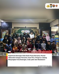 TANJUNG SELOR, Senin 9 Maret 2026 – Dalam rangka mempererat tali silaturahmi serta meningkatkan kebersamaan di bulan suci Ramadan, jajaran Polresta Bulungan menggelar kegiatan buka puasa bersama yang dihadiri oleh personel kepolisian, anak yatim, warakawuri Polri, insan pers, serta pengurus Bhayangkari Cabang Kota Bulungan.