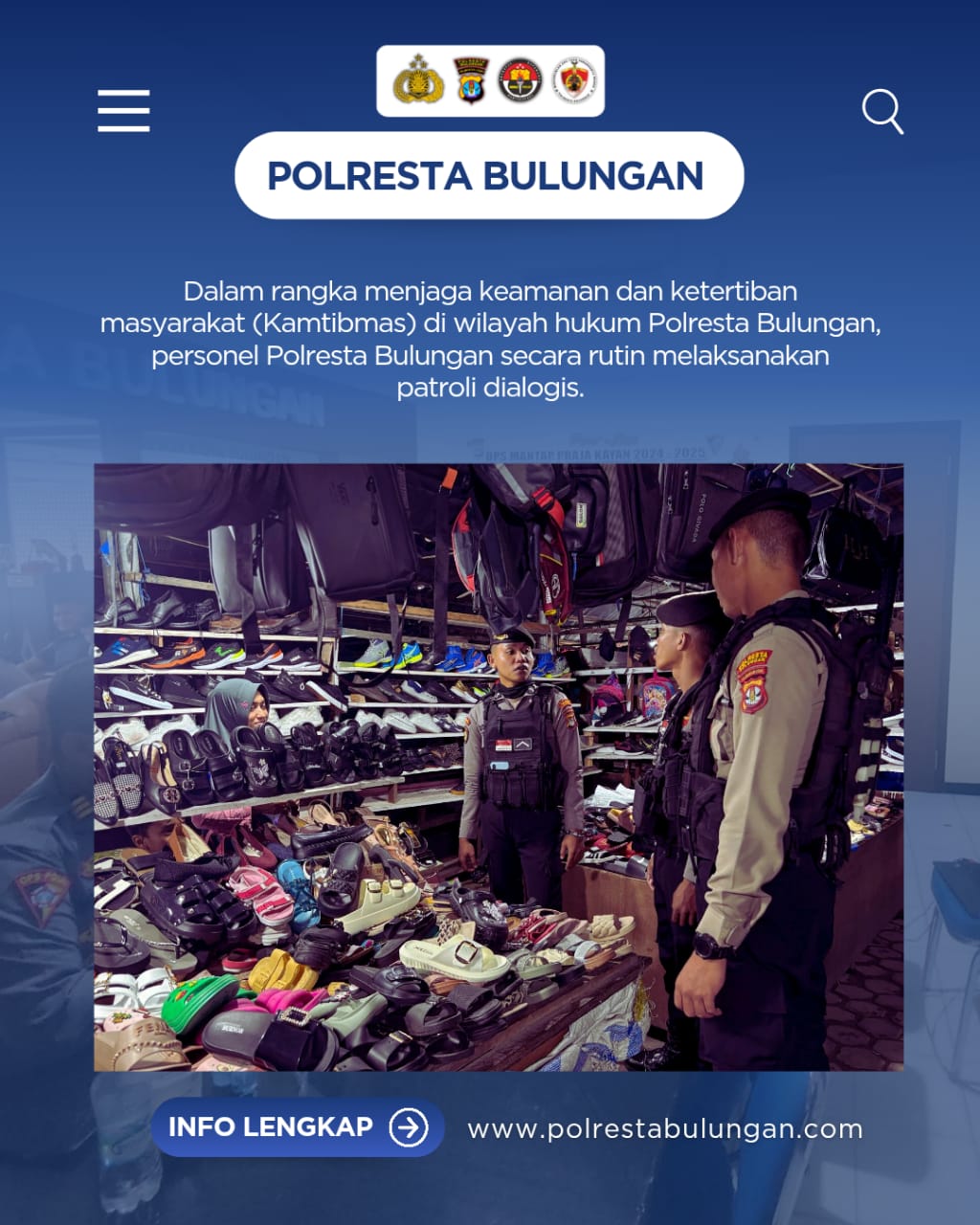 TANJUNG SELOR – Polda Kaltara, Polresta Bulungan – Dalam upaya menciptakan situasi keamanan dan ketertiban masyarakat (Kamtibmas) yang kondusif di wilayah hukumnya, Polresta Bulungan terus mengintensifkan patroli dialogis ke berbagai titik strategis di Kabupaten Bulungan. Kegiatan ini tidak hanya menitikberatkan pada pengawasan wilayah, tetapi juga memperkuat komunikasi dan kedekatan antara polisi dan masyarakat.