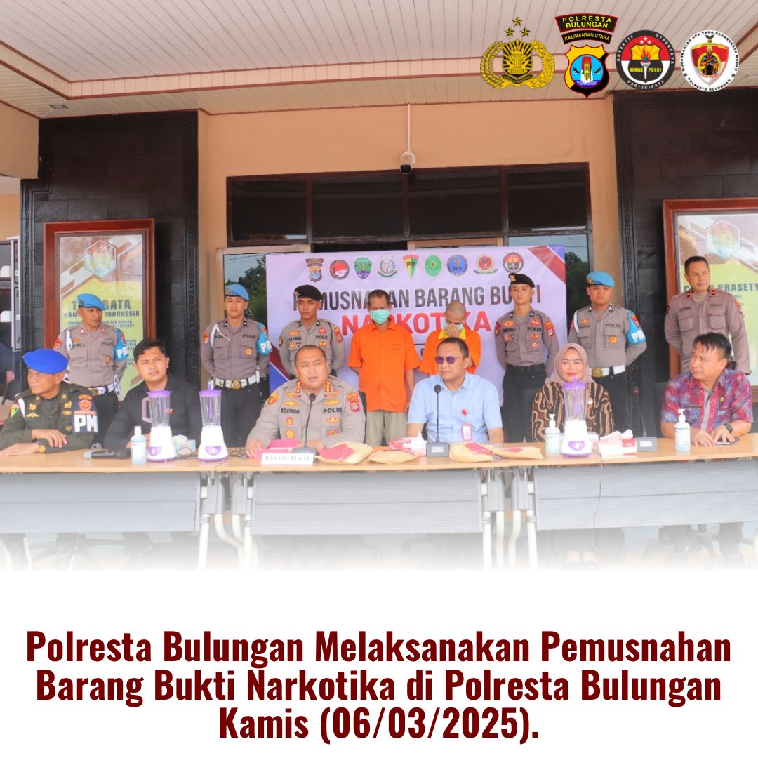 TANJUNG SELOR, Polda Kaltara, Polresta Bulungan – Polresta Bulungan kembali menunjukkan komitmennya dalam memberantas penyalahgunaan narkotika. Pada Kamis (6/3/2025), Kapolresta Bulungan Kombes Pol Rofikoh Yunianto, S.I.K secara langsung memimpin jalannya pemusnahan barang bukti (BB) narkotika yang berlangsung di Mako Polresta Bulungan.