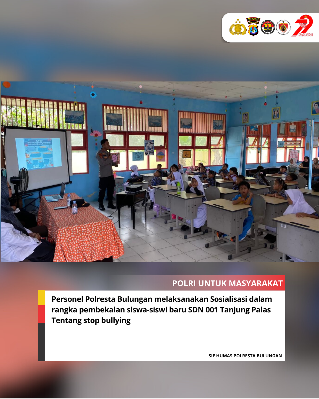 TANJUNG SELOR, Polda Kaltara, Polresta Bulungan – Jajaran Personel Polsek Tanjung Palas melaksanakan kegiatan sosialisasi “Stop Bullying” kepada para orang tua dan murid baru di SDN 001 Tanjung Palas, Rabu (16/7/2025).
