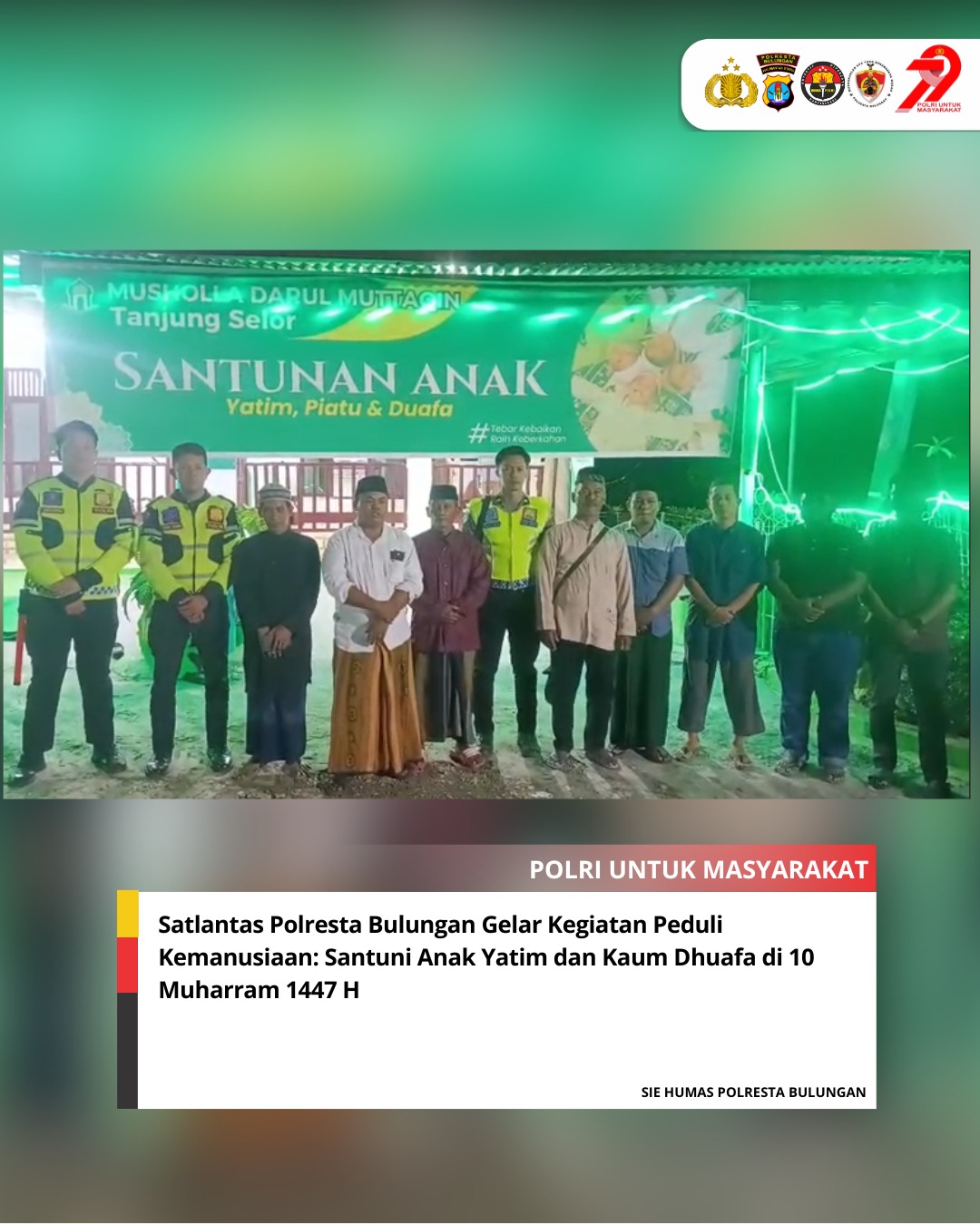 TANJUNG SELOR, Polda Kaltara, Polresta Bulungan — Satuan Lalu Lintas (Satlantas) Polresta Bulungan menggelar kegiatan sosial bertajuk Satlantas Peduli Kemanusiaan dalam rangka memperingati 10 Muharram 1447 Hijriah yang dikenal sebagai Idul Yatama, atau hari kegembiraan bagi anak yatim-piatu dan kaum dhuafa, Minggu (6/7/2025).