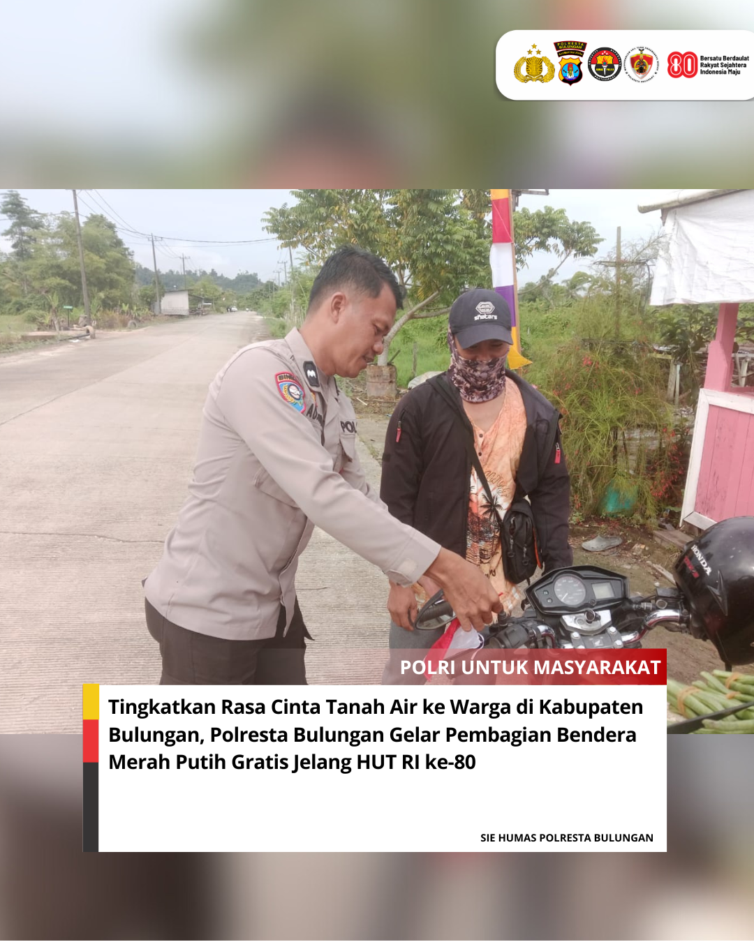 Tingkatkan Rasa Cinta Tanah Air ke Warga di Kabupaten Bulungan, Polresta Bulungan Gelar Pembagian Bendera Merah Putih Gratis Jelang HUT RI ke-80